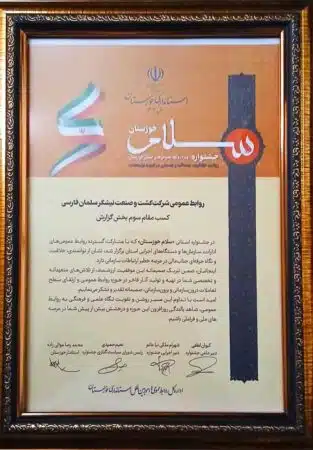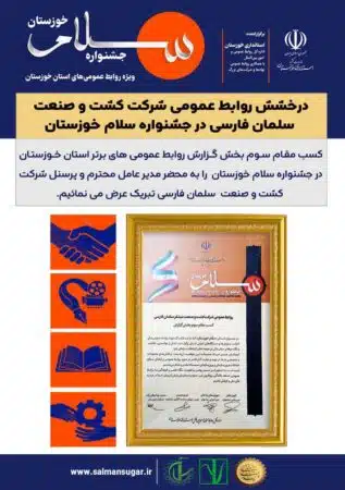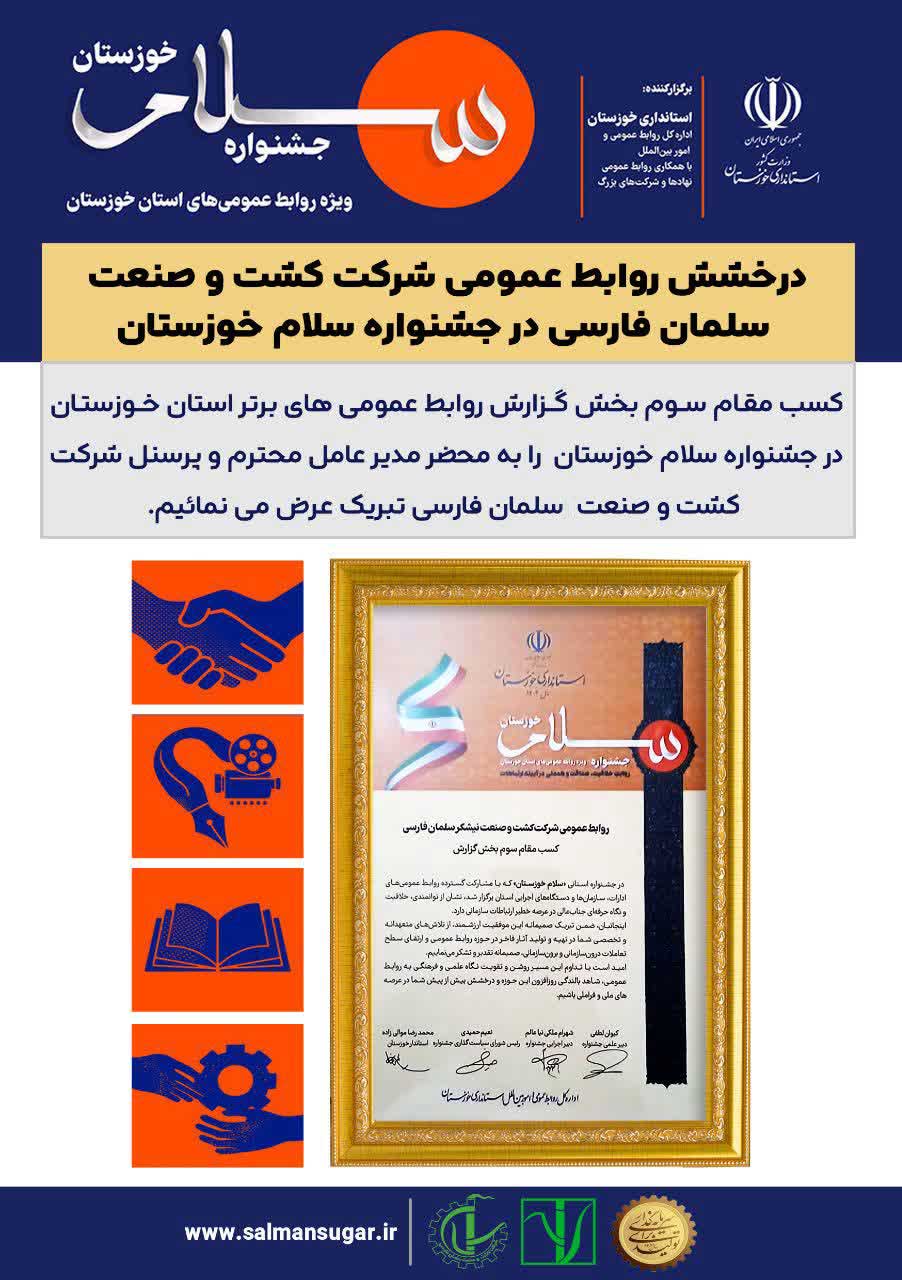 روابط عمومی شرکت کشت و صنعت سلمان فارسی موفق شد با کسب رتبه سوم در بخش گزارش جشنواره استانی«سلام خوزستان» بار دیگر توانمندیهای خود را در عرصه ارتباطات و رسانه به نمایش بگذارد. این جشنواره با مشارکت گسترده روابط عمومیهای ادارات، سازمانها و نهادهای اجرایی استان خوزستان برگزار شد و یکی از معتبرترین رویدادهای تخصصی این حوزه بهشمار میرود.